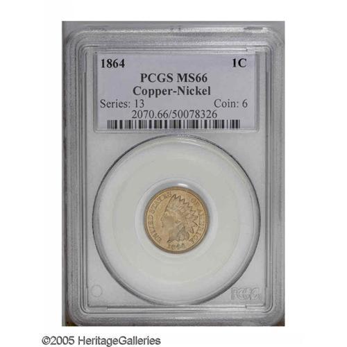 <B>1864<1C> Copper-Nickel MS66 PCGS.</B></I> Sharply struck and with exceptional eye appeal. The feathers are very well defined except at the extreme tips, while the diamonds are all fully defined. Due to the hardness of the copper-nickel composition, which was still relatively new to the mint, design details were not always sharp. It is important for today's collector to seek an example that shows good definition. This premium Gem has rich gold patina with satiny surfaces. Population: 7 in 66, only 1 finer (11/05).<BR><I>From The Joshua and Ally Walsh Collection of United States Cents.</B></I>