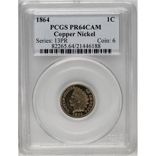 <B>1864<1C> Copper Nickel PR64 Cameo PCGS.</B></I> This stunning 1864 Copper-Nickel cent displays delicate orange-tan color and distinct field to motif contrast. The design elements are sharply executed, including excellent delineation on the four diamonds. A small area of die polish is noted to the left of the Indian's ear, with a couple of thin, as made, line-like planchet defects that radiate from the polished area.<BR><I>From The Empire Tree Collection.</B></I>