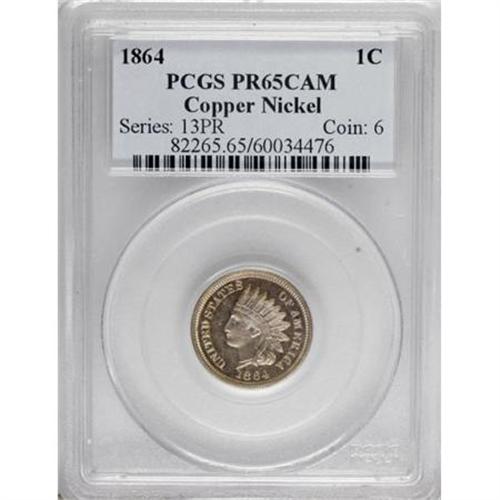 <B>1864 1C Copper Nickel PR65 Cameo PCGS.</B></I> This amazing proof has exceptional light tan color, consistent with the composition of the copper-nickel cents. The well-preserved surfaces are fully mirrored with highly lustrous and frosty devices. The result is a delightful cameo appearance that is highly desired by collectors of proof coinage. Population: 16 in 65 Cameo, 7 finer (6/07).<BR><BR><b>Shipping:</b> Coins & Currency (<a target="_blank" href="http://www.heritageauctions.com/common/shipping.php">view shipping information</a>)