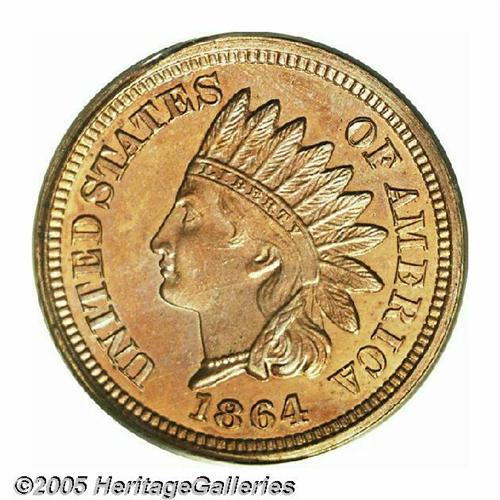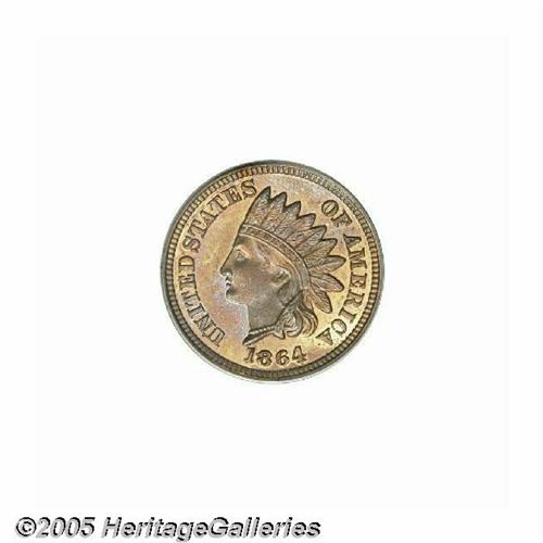 <B>1864<1C> Copper-Nickel PR65 PCGS.</B></I> Only 370 proofs were struck of the 1864 Copper-Nickel cent, and it is reliably estimated that today no more than 100 pieces are known in all grades. This is a glittering, deeply mirrored example that has lovely bright orange-red surfaces with a splash or two of soft violet. The design elements are boldly struck, and the pleasing surfaces display just a few unobtrusive flecks over each side. An exceptional, high grade proof. Population: 39 in 65, 11 finer (6/05).<BR><I>From The Melrose Bay Collection.</B></I>
