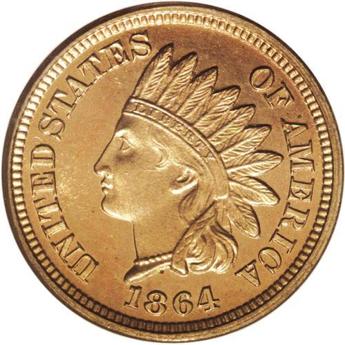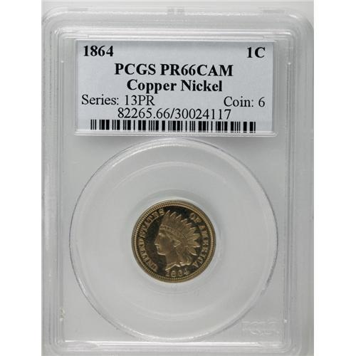 <B>1864<1C> Copper Nickel PR66 Cameo PCGS.</B></I> This beautiful piece is well deserving of its Cameo designation, with pristine fields of copper-gold, accented by glints of green, that contrast well against the heavily frosted devices. Although this issue is normally found attractive and with cameo contrast, few proofs were minted, and the issue as a whole is much scarcer than the 1862. A nice piece for the grade, and among the finest at PCGS. Population: 7 in 66, 0 finer (7/06).