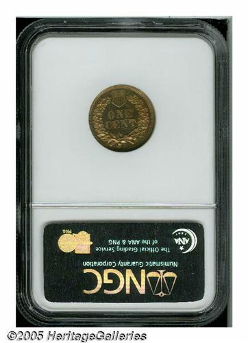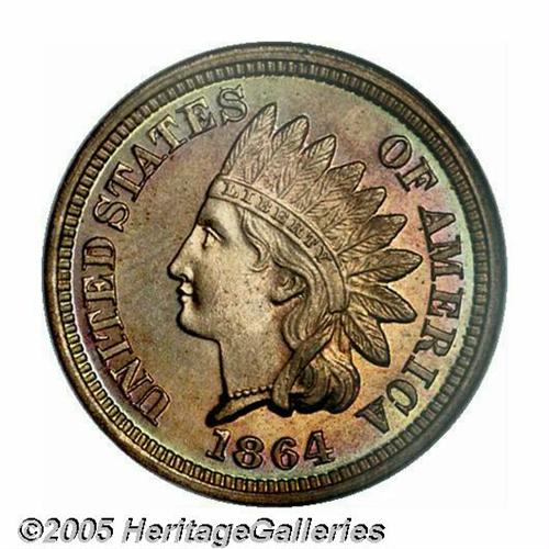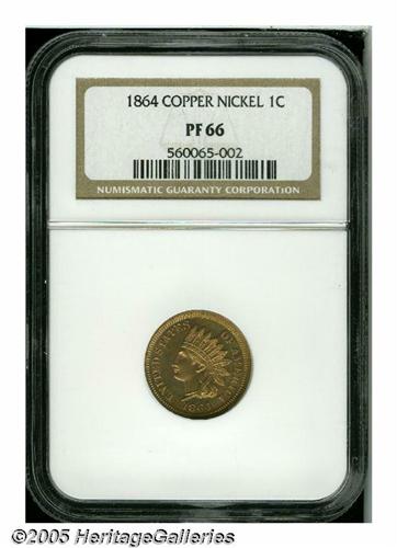 <B>1864<1C> Copper-Nickel PR66 NGC.</B></I> Only 370 proofs were struck of the 1864 Copper-Nickel cent, and it is reliably estimated that today no more than 100 pieces are known in all grades. This is a glittering, deeply mirrored example that has lovely bright orange-red surfaces with an accent of olive around the obverse rim and deeper cherry-red around the reverse rim. An exceptional, high grade proof. Population: 10 in 66, 0 finer (4/05).