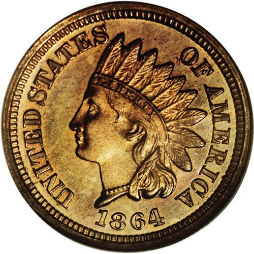 <B>1864<1C> Copper Nickel PR66 Ultra Cameo NGC.</B></I> Proof copper-nickel shield reverse Indian cents were struck for just five years, and although mintages reached 1,000 pieces in 1860 and 1861, net production was lower since many unsold pieces were melted. 1864 is the lowest mintage proof date, probably because it was only struck early in the year, before the introduction of the bronze alloy used for the remainder of the series. This needle-sharp Premium Gem displays consistent, thick frost throughout the devices and legends, and their contrast with the darkly mirrored fields is formidable. Subtle lime, honey, and plum tints emerge when the piece is rotated beneath a light. Census: 3 in 66 Ultra Cameo, none finer (4/06).