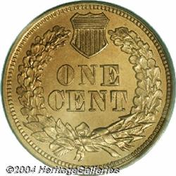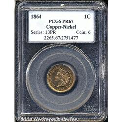 <B>1864<1C> Copper-Nickel PR67 PCGS.</B></I> Extremely rare in this condition as the official mintage was a mere 370 pieces with most of the survivors below average compared to the quality of the 1862. The color on this piece is even red throughout with dazzling, deeply mirrored fields. The surfaces are virtual perfection and only one other piece has been so graded by either of the major services (9/04). <BR><BR><B>Important notice:</B> Heritage usually auctions material at the rate of 200-250 lots per hour. On some occasions eBay Live bid software or the Internet may not be able to keep up with the pace of the auction. We recommend placing a realistic absentee bid now as insurance to avoid disappointment. Occasionally the auctioneer may eliminate or reject an eBay Live bid, and the auctioneer may also reopen a lot after the close of the eBay live bidding (usually because we missed an audience bid), and may reject your bid even if it shows you as the winning bidder. By bidding via eBay Live, you agree that Heritage may award the lot to another bidder at its sole discretion under the circumstances described above or any other reasonable circumstances. Since eBay bids are not shown to us until we open the lot on the floor, we treat those bids just like floor bids. In most cases the floor responds before the eBay bid is presented to us, due to Internet lag time, so for consistency we have made it a policy that floor bids are always considered first over tie eBay live bids. Also please note that all Heritage lots purchased through eBay Live carry a 20% Buyer's Premium. Please make sure you read the Terms and Conditions before you bid.