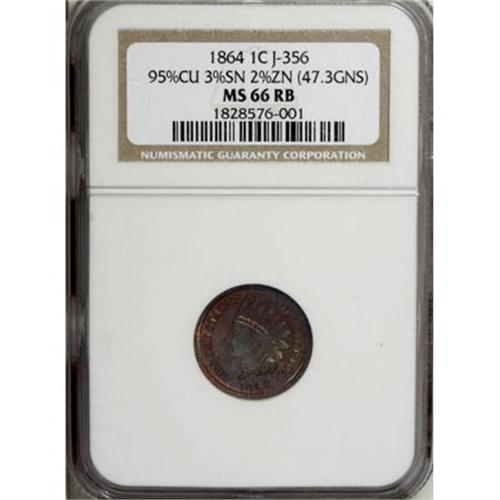 <B>1864 1C Indian Cent, Judd-356, Pollock-426, Low R.6, MS66 Red and Brown NGC.</B></I> Struck from the dies for the regular issue 1864 No L Indian cent. Struck in a curious composition of 95% copper, 3% tin, and 2% zinc with a plain edge. Much experimentation was conducted on various alloys in 1864, and a great deal has still to be learned about these pieces, their composition, thickness, and weight. The surfaces are nearly flawless and the strike only lacks complete feather definition on the ends of the headdress. Rich cherry red mint luster is interspersed with deep blue color over each side. <BR><BR><b>Shipping:</b> Coins & Currency (<a target="_blank" href="http://www.heritageauctions.com/common/shipping.php">view shipping information</a>\)