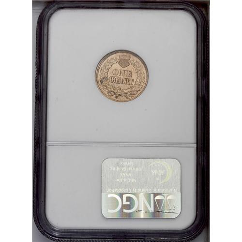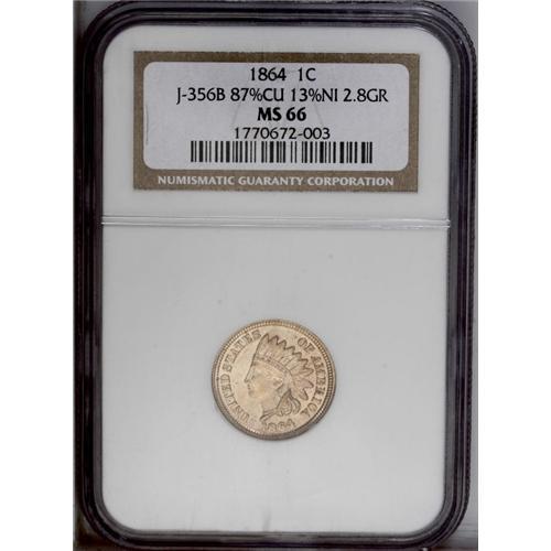 <B>1864<1C> J-356B, Unlisted in Pollock, R.8, MS66 NGC.</B></I> Weight: 2.8 grams. One of only two or three experimental pieces struck in 87% parts copper and 13 parts nickel with regular-issue Indian cent dies and a plain edge. A brightly lustrous example with a sharp strike and no mentionable marks and quite probably the finest known. One dark toning spot on the left side of the wreath is mentioned for pedigree purposes. A worthwhile experimental alloy striking. Currently, this is the only example certified by either service (6/06).