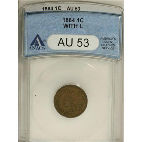 <B>1864 1C L On Ribbon AU53 ANACS.</B></I> . NGC Census: (10/329). PCGS Population (26/242). Mintage: 39,233,712. Numismedia Wsl. Price for NGC/PCGS coin in AU53: $254. (#2079)<BR><BR><B>Coin Engraver:</B> James B. Longacre<BR><BR><b>Shipping:</b> Coins & Currency (<a target="_blank" href="http://www.heritageauctions.com/common/shipping.php">view shipping information</a>)