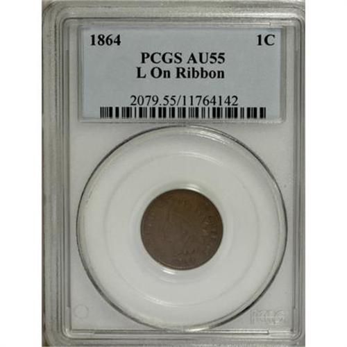 <B>1864 1C L On Ribbon AU55 PCGS.</B></I> PCGS Population (57/189). NGC Census: (39/292). Mintage: 39,233,712. Numismedia Wsl. Price for NGC/PCGS coin in AU55: $270. (#2079)<BR><BR><B>Coin Engraver:</B> James B. Longacre<BR><BR><b>Shipping:</b> Coins & Currency (<a target="_blank" href="http://www.heritageauctions.com/common/shipping.php">view shipping information</a>)