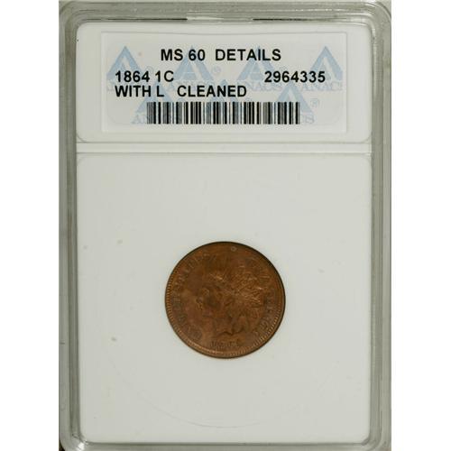 <B>1864 1C L On Ribbon Brown--Cleaned--ANACS. MS60 Details.</B></I> NGC Census: (1/221). PCGS Population (6/121). Mintage: 39,233,712. Numismedia Wsl. Price: $292. (#2079)<BR><BR><b>Shipping:</b> Coins & Currency (<a target="_blank" href="http://www.heritageauctions.com/common/shipping.php">view shipping information</a>)
