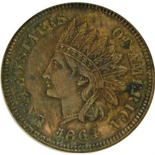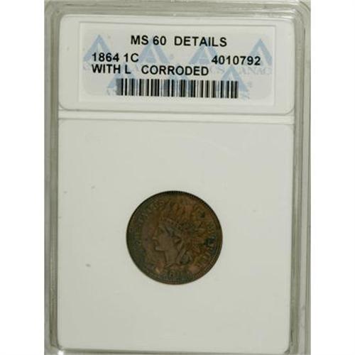 <B>1864 1C L On Ribbon Brown--Corroded--ANACS. MS60 Details.</B></I> NGC Census: (1/223). PCGS Population (6/131). Mintage: 39,233,712. Numismedia Wsl. Price for NGC/PCGS coin in MS60: $300. (#2079)<BR><BR><B>Coin Engraver:</B> James B. Longacre<BR><BR><b>Shipping:</b> Coins & Currency (<a target="_blank" href="http://www.heritageauctions.com/common/shipping.php">view shipping information</a>)