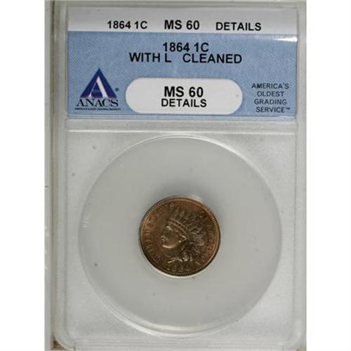 <B>1864 1C L On Ribbon Brown--Cleaned--ANACS. MS60 Details.</B></I> NGC Census: (1/225). PCGS Population (6/133). Mintage: 39,233,712. Numismedia Wsl. Price for NGC/PCGS coin in MS60: $300. (#2079)<BR><BR><B>Coin Engraver:</B> James B. Longacre<BR><BR><b>Shipping:</b> Coins & Currency (<a target="_blank" href="http://www.heritageauctions.com/common/shipping.php">view shipping information</a>)