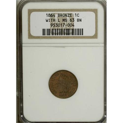 <B>1864 1C L On Ribbon MS63 Brown NGC.</B></I> NGC Census: (67/74). PCGS Population (55/53). Mintage: 39,233,712. Numismedia Wsl. Price for NGC/PCGS coin in MS63: $440. (#2079)<BR><BR><B>Coin Engraver:</B> James B. Longacre<BR><BR><b>Shipping:</b> Coins & Currency (<a target="_blank" href="http://www.heritageauctions.com/common/shipping.php">view shipping information</a>)
