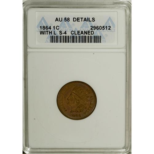 <B>1864 1C L On Ribbon--Cleaned--ANACS. AU58 Details.</B></I> S-4. NGC Census: (63/222). PCGS Population (42/131). Mintage: 39,233,712. Numismedia Wsl. Price for NGC/PCGS coin in AU58: $267. (#2079)<BR><BR><b>Shipping:</b> Coins & Currency (<a target="_blank" href="http://www.heritageauctions.com/common/shipping.php">view shipping information</a>)