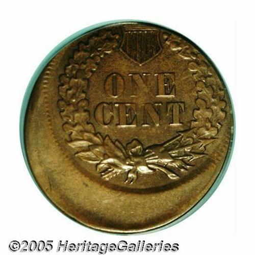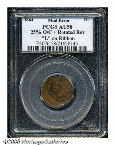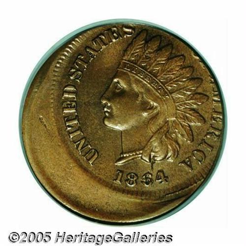 <B>1864<1C> L On Ribbon Indian Cent--25% Off Center and Rotated Dies--AU58 PCGS.</B></I> Broadly off center toward 2 o'clock. The dies are rotated about 100 degrees clockwise, a second dramatic mint error. Clashmarks are present along the interior of the right wreath, and an apparent strike-thru affects the 6 in the date. Golden-brown in color with rich olive overtones, a faint pinscratch is east of the 4 in the date.<BR><I>From The Larry Rausch Collection of Errors, Part Four.</B></I>
