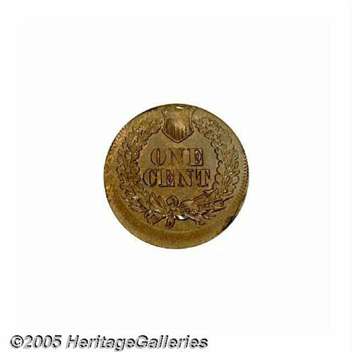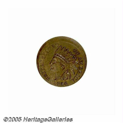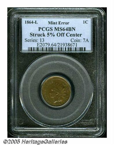 <B>1864<1C> L On Ribbon Indian Cent--Struck 5% Off Center--MS64 Brown PCGS.</B></I> Struck several degrees off center toward 6 o'clock, the date is intact although the denticles beneath are off the flan. A beautiful chocolate-brown near-Gem with glossy luster and unmarked surfaces. A mint-made strike-thru affects about half of the shield. An impressive mint error.
