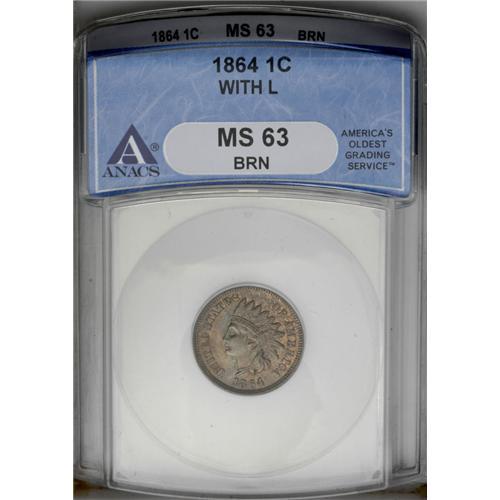 <B>1864<1C> L On Ribbon MS63 Brown ANACS.</B></I> Reddish-tan and forest-green toning are seen over the obverse. The reverse displays purple-violet, ochre-orange, and steel-green coloration. Struck with great precision, the deeply toned surfaces are unmarked.