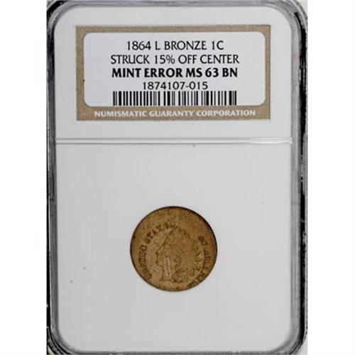 <B>1864 1C L On Ribbon Indian Cent--Struck 15% Off Center--MS63 Brown NGC.</B></I> Off center toward 6 o'clock, but most of the date is intact. A broad area of unstruck surface dominates the upper obverse and lower reverse. A mark-free and satiny golden-brown Civil War cent with minor buildup near ONE CENT. The L on Ribbon variety is much scarcer than its No L counterpart.<BR><BR><B>Coin Engraver:</B> James B. Longacre<BR><BR><b>Shipping:</b> Coins & Currency (<a target="_blank" href="http://www.heritageauctions.com/common/shipping.php">view shipping information</a>)