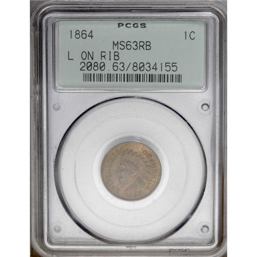<B>1864<1C> L On Ribbon MS63 Red and Brown PCGS.</B></I> FS-006.5, Snow-5b. Lavender, olive, orange, and gold tones interchange across this unmarked better date Indian cent. Struck from a worn obverse die. In a green label holder. <BR><BR><B>Important notice:</B> Heritage usually auctions material at the rate of 200-250 lots per hour. On some occasions eBay Live bid software or the Internet may not be able to keep up with the pace of the auction. We recommend placing a realistic absentee bid now as insurance to avoid disappointment. Occasionally the auctioneer may eliminate or reject an eBay Live bid, and the auctioneer may also reopen a lot after the close of the eBay live bidding (usually because we missed an audience bid), and may reject your bid even if it shows you as the winning bidder. By bidding via eBay Live, you agree that Heritage may award the lot to another bidder at its sole discretion under the circumstances described above or any other reasonable circumstances. Since eBay bids are not shown to us until we open the lot on the floor, we treat those bids just like floor bids. In most cases the floor responds before the eBay bid is presented to us, due to Internet lag time, so for consistency we have made it a policy that floor bids are always considered first over tie eBay live bids. Also please note that all Heritage lots purchased through eBay Live carry a 20% Buyer's Premium. Please make sure you read the Terms and Conditions before you bid. This lot is being auctioned in conjunction with a live floor auction by Heritage Galleries & Auctioneers. All final auction and invoice information will be supplied by Heritage Galleries & Auctioneers, and all other information should be considered preliminary. Lot:373 <BR><BR><B>Winning Notification and Billing:</B> After the FINAL session in this auction is complete, Heritage will send e-mail and snail mail invoices. This process normally takes several days. All final auction and invoice information will be supplied by Heritage Galleries & Auctioneers, and all other information should be considered preliminary. <BR><BR>This auction will be conducted on a live auction floor and over the Internet through eBay Live. If you choose to place an absentee bid, please take a moment to <font color='#0000ff'><u><a href='http://pages.ebay.com/liveauctions/help/before/laabsentee.html'>learn how eBay Live absentee bidding works</a></u></font><font color='#000000'>