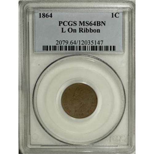<B>1864 1C L On Ribbon MS64 Brown PCGS.</B></I> The obverse shows a subtle maroon shade with elements of orange at the margins, while the reverse shows greater intermingling of the two colors. A well-defined and attractive example of this first initialed Indian cent issue.<BR><BR><B>Coin Engraver:</B> James B. Longacre<BR><BR><b>Shipping:</b> Coins & Currency (<a target="_blank" href="http://www.heritageauctions.com/common/shipping.php">view shipping information</a>)