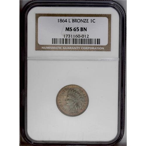 <B>1864<1C> L On Ribbon MS65 Brown NGC.</B></I> Although designated as Brown by NGC, this piece has sufficient orange-red to merit a Red and Brown designation, although the devices are toned lime-green. An unabraded and crisply struck Gem.