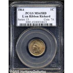1864 1C L On Ribbon MS65 Red PCGS. A bright, boldly detailed Gem of this popular variety. Research shows that less than 20 percent of the original mintage for this premier Bronze Cent issue has the designer's initial (Longacre) on the obverse. The L on the ribbon is quite obvious, even to the naked eye, and both the color and luster are especially vibrant. Sprays of burnt-gold and rose patina are seen on the right side of the obverse. Population: 30 in 65, 3 finer (10/03).From the Richard Collection. Important notice: Heritage usually auctions material at the rate of 200-250 lots per hour. On some occasions eBay Live bid software or the Internet may not be able to keep up with the pace of the auction. We recommend placing a realistic absentee bid now as insurance to avoid disappointment. Occasionally the auctioneer may eliminate or reject an eBay Live bid, and the auctioneer may also reopen a lot after the close of the eBay live bidding (usually because we missed an audience bid), and may reject your bid even if it shows you as the winning bidder. By bidding via eBay Live, you agree that Heritage may award the lot to another bidder at its sole discretion under the circumstances described above or any other reasonable circumstances. Also please note that all Heritage lots purchased through eBay Live carry a 20% Buyer's Premium. Please make sure you read the Terms and Conditions before you bid.