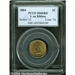 <B>1864<1C> L On Ribbon MS65 Red PCGS.</B></I> Even though 5 million pieces were struck of this issue, it was not saved in great quantities. Only 34 Gems have been certified by PCGS with three finer (7/04). This is an attractive, well struck example that has lovely mint red luster intact over both sides. An attractive, problem-free coin that appears to also be almost carbon-free. <BR><BR><B>Important notice:</B> Heritage usually auctions material at the rate of 200-250 lots per hour. On some occasions eBay Live bid software or the Internet may not be able to keep up with the pace of the auction. We recommend placing a realistic absentee bid now as insurance to avoid disappointment. Occasionally the auctioneer may eliminate or reject an eBay Live bid, and the auctioneer may also reopen a lot after the close of the eBay live bidding (usually because we missed an audience bid), and may reject your bid even if it shows you as the winning bidder. By bidding via eBay Live, you agree that Heritage may award the lot to another bidder at its sole discretion under the circumstances described above or any other reasonable circumstances. Since eBay bids are not shown to us until we open the lot on the floor, we treat those bids just like floor bids. In most cases the floor responds before the eBay bid is presented to us, due to Internet lag time, so for consistency we have made it a policy that floor bids are always considered first over tie eBay live bids. Also please note that all Heritage lots purchased through eBay Live carry a 20% Buyer's Premium. Please make sure you read the Terms and Conditions before you bid. </span></font></tr></table></td></tr></table>