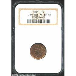 1864 1C L On Ribbon MS65 Red and Brown NGC. A bold striking that has mellowed across the centers with blushes of lilac patina. Numerous tiny carbon flecks are primarily seen on the obverse.From the Ohio Collection. Important notice: We expect to be auctioning lots at the rate of 200-250 per hour. Sometimes eBay Premier live bid software cannot keep up with that pace, so we strongly recommend that you place a realistic proxy bid now as insurance to avoid disappointment. Also please note that all Heritage/CAA lots purchased through eBay Premier carry a 20% Buyer's Premium. Please make sure you read the Terms and Conditions.