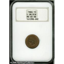 <B>1864 1C L On Ribbon MS65 Red and Brown NGC.</B></I> A crisply struck Gem with lovely gold and rose color. Lustrous and unmarked, although thorough inspection reveals a few miniscule carbon flecks. Struck from heavily clashed dies. Lot:5206