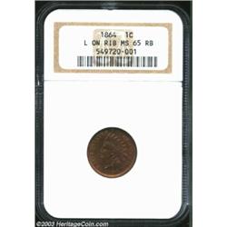 1864 1C L On Ribbon MS65 Red and Brown NGC. The borders have rich orange-gold color, while the devices have deep lavender patina. Well struck with good luster and pleasing surfaces. A heavy die crack (as made) wanders across the central arrow to the reverse border at 4 and 7 o'clock. Important notice: We expect to be auctioning lots at the rate of 200-250 per hour. On occasion eBay live bid software cannot keep up with the pace of the auctions where 4-5 lots per minute can hammer down, so we recommend that you place a realistic absentee bid now as insurance to avoid disappointment. Also please note that all Heritage/CAA lots purchased through eBay Live carry a 20% Buyer's Premium. Please make sure you read the Terms and Conditions.