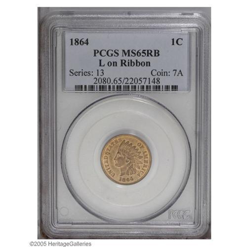 <B>1864<1C> L On Ribbon MS65 Red and Brown PCGS.</B></I> Attractive golden-tan surfaces display sharply struck design elements, and are well preserved. Nice overall eye appeal. Population: 54 in 65, 3 finer (10/05).