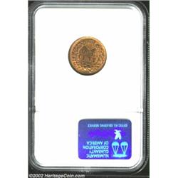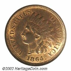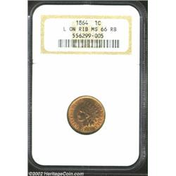 1864 1C L On Ribbon MS66 Red and Brown NGC. A desirable representative of this popular first-year bronze Cent variety, both sides exhibit uncommon sharpness of strike for the type. In fact, there is not a single ill-defined feature, and the all-important L initial is readily evident to the naked eye. There is plenty of original mint luster in orange-red shades, particularly on the reverse, with some mottled medium brown patina also in evidence. NGC and PCGS combined report only 21 coins at the MS66 Red and Brown level, and there are none finer with this color designation (7/02). Important notice: We expect to be auctioning lots at the rate of 200-250 per hour. Sometimes eBay Premier live bid software cannot keep up with that pace, so we strongly recommend that you place a realistic proxy bid now as insurance to avoid disappointment. Also please note that all Heritage/CAA lots purchased through eBay Premier carry a 20% Buyer's Premium. Please make sure you read the Terms and Conditions.