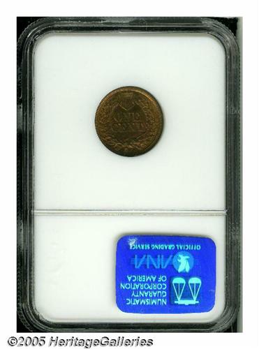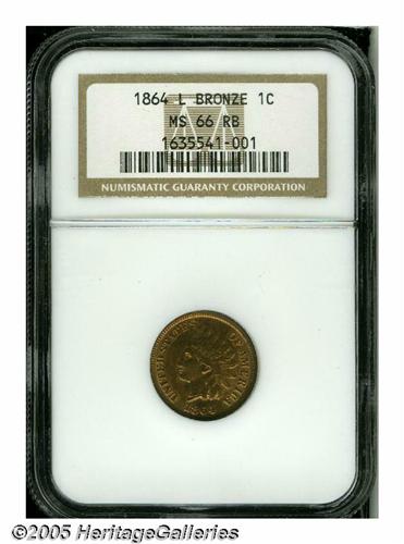 <B>1864<1C> L On Ribbon MS66 Red and Brown NGC.</B></I> Pretty golden-tan color rests over lustrous surfaces, with the reverse center displaying some faded reddish-brown. The design features are generally well struck, though the second diamond from the top is weak. There are no apparent contact marks or unsightly spots to report. NGC and PCGS combined have certified just 23 pieces in this grade and color designation, with none finer (3/05).