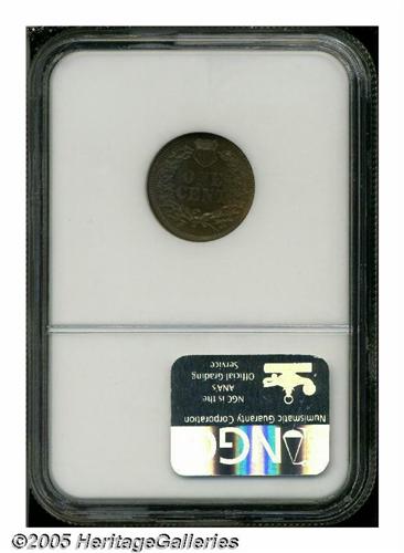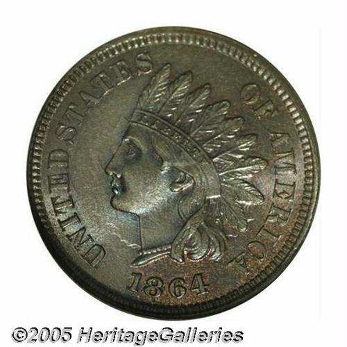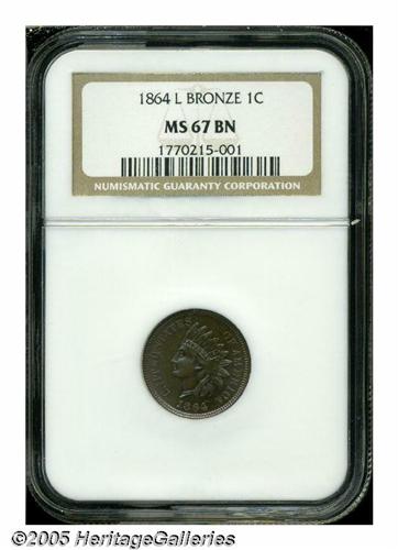 <B>1864<1C> L On Ribbon MS67 Brown NGC.</B></I> The 1864-L was not saved in large numbers and, consequently, is not generally found in high grades, most likely because the addition of Longacre's initial was not readily discernible to the general public. This piece, however, is a splendid example with glossy brown surfaces. Unlike many of the high grade survivors known, this piece displays full striking details in all areas. The surfaces are generally brown with close examination revealing minute flecks of red and blue coloring also. Strong die clashing is seen around the Indian's face on the obverse, but little evidence of clashing is noted on the reverse. As one would expect from a coin in this grade, there are no noticeable abrasions on either side, just smooth, glossy, undisturbed brown patina. This is the finest 1864-L certified by either of the major services (4/05), and it is not equaled or excelled by coins in Red or Red and Brown.