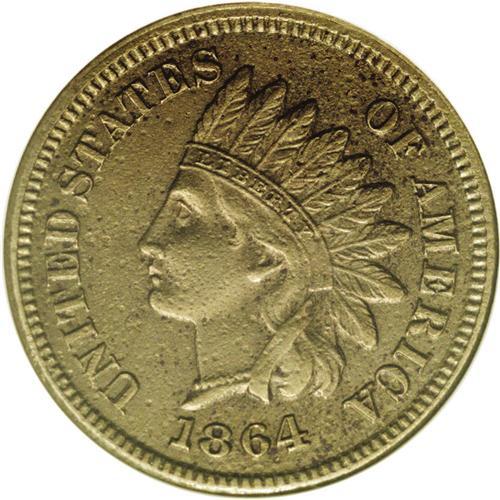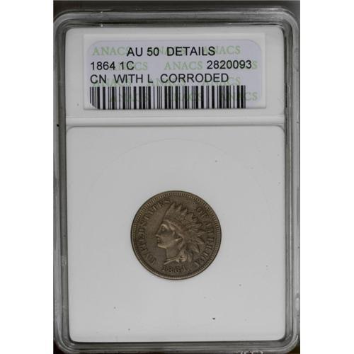 <B>1864<1C> L On Ribbon--Struck on a Copper-Nickel Planchet, Corroded--ANACS. AU50 Details.</B></I> This well struck medium-brown and rose example has little if any actual wear, but is moderately porous and has distributed tiny freckles of ebony verdigris. The progression of 1864 cents is Copper-Nickel, Bronze No L, Bronze L On Ribbon. A few Copper-Nickel L On Ribbon pieces exist. Richard Snow, in the second edition of his 1859-1869 attribution guide, states three examples are known, two pieces from proof dies, and a single business strike. The present piece, a recent discovery, is also a business strike, and does not match any of the three L On Ribbon proof obverse dies. The Copper-Nickel L On Ribbon pieces are difficult to classify. They are listed as Judd-358, but could also be considered off-metal errors, similar to the famous 1943 bronze cent. However, since they were struck on regular issue dies, in an alloy used for circulation that year, they are technically a regular issue rather than a mint error or pattern. If so, Snow notes, "they would certainly be one of the rarest regular issue coins in all numismatics."