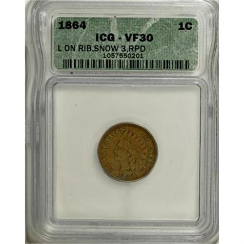 <B>1864 1C L On Ribbon VF30 ICG. Snow</B></I>-3 RPD<B>.</B></I> NGC Census: (15/429). PCGS Population (20/437). Mintage: 39,233,712. Numismedia Wsl. Price for NGC/PCGS coin in VF30: $178. (#2079)<BR><BR><B>Coin Engraver:</B> James B. Longacre<BR><BR><b>Shipping:</b> Coins & Currency (<a target="_blank" href="http://www.heritageauctions.com/common/shipping.php">view shipping information</a>)