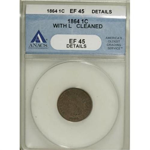 <B>1864 1C L On Ribbon--Cleaned--ANACS. XF45 Details.</B></I> NGC Census: (36/353). PCGS Population (65/305). Mintage: 39,233,712. Numismedia Wsl. Price for NGC/PCGS coin in XF45: $228. (#2079)<BR><BR><B>Coin Engraver:</B> James B. Longacre<BR><BR><b>Shipping:</b> Coins & Currency (<a target="_blank" href="http://www.heritageauctions.com/common/shipping.php">view shipping information</a>)