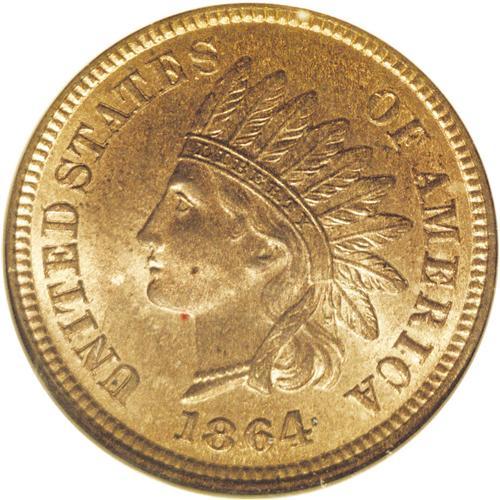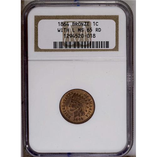 <B>1864<1C> L on Ribbon MS65 Red NGC.</B></I> Snow-17. The 8 in the date is nicely recut. This lustrous and exquisitely struck Gem has slightly mellowed honey-gold color. A few minute carbon flecks do not distract, and the surfaces are seemingly free from contact. Much scarcer than the 1864 No L or Bronze varieties, the 1864 L on Ribbon is rare with full Red color in any grade. Census: 14 in 65, 3 finer (3/06).