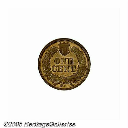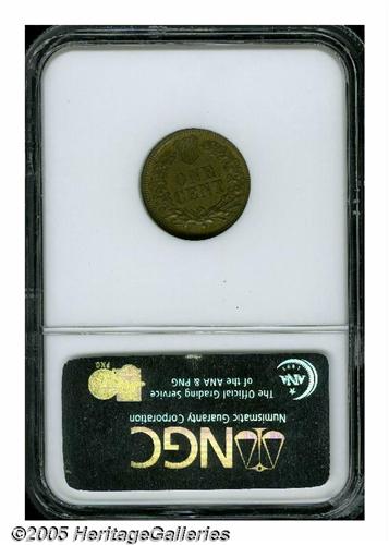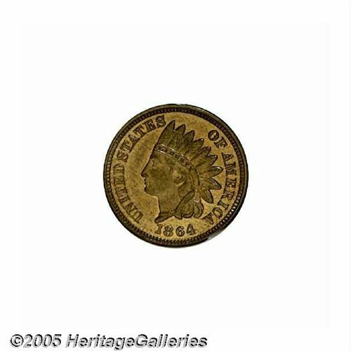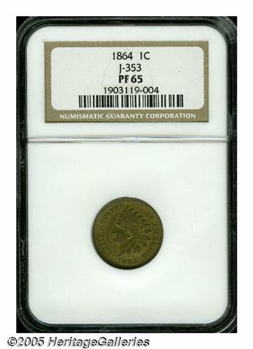 <B>1864<1C> One Cent, Judd-353, Pollock-425, Low R.6, PR65 NGC.</B></I> The design is the same as that of the regular issue 1864 No L Indian Cent, struck in a copper-aluminum alloy with a plain edge. A number of experimental alloys were struck in 1864. This piece is presumably a copper-aluminum alloy in a 13 to 1 ratio (93% to 7%). These are traditionally described as having a golden color, but on this piece time has mellowed the color to a glossy olive-brown patina. Not quite fully struck on the tips of the feathers of the headdress.