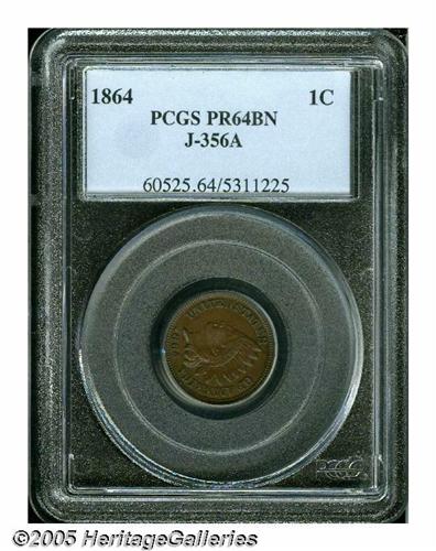 <B>1864<1C> One Cent, Judd-356A, Pollock-427, Low R.6, PR64 Brown PCGS.</B></I> Snow-PT1d. While both the obverse and the reverse of this example mimic those of the 1864 No L business strike cent, this pattern was struck on bronze planchets whose thickness resembles that of the copper-nickel issues. A seamless mahogany-brown near-Gem, razor-sharp and imposing.
