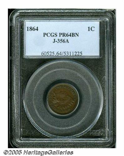 <B>1864<1C> One Cent, Judd-356A, Pollock-427, Low R.6, PR64 Brown PCGS.</B></I> Snow-PT1d. While both the obverse and the reverse of this example mimic those of the 1864 No L business strike cent, this pattern was struck on bronze planchets whose thickness resembles that of the copper-nickel issues. A seamless mahogany-brown near-Gem, razor-sharp and imposing.