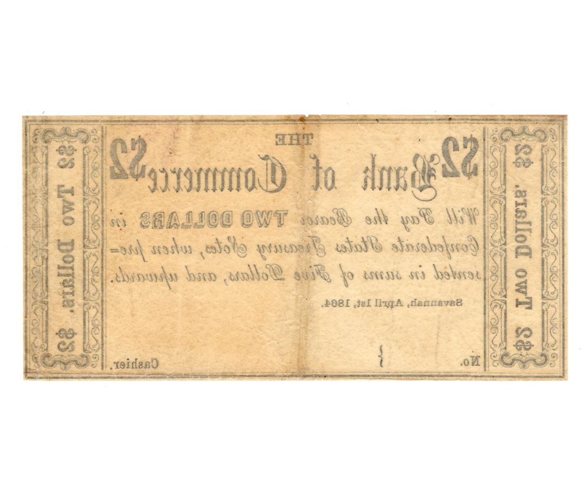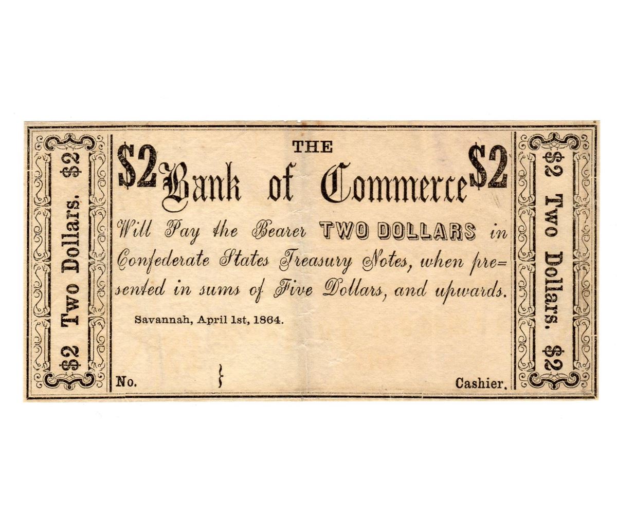 One 1864 $2 Bank of Commerce Confederate Currency Note.