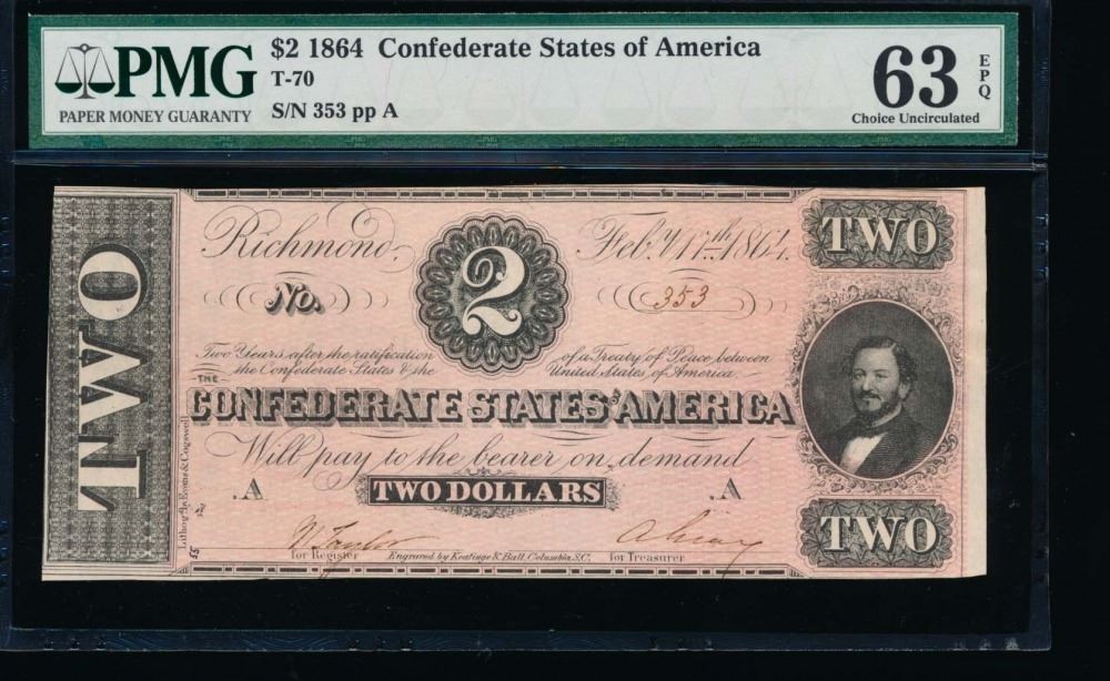One 1864 $2 Confederate RADAR Note PMG 63EPQ.