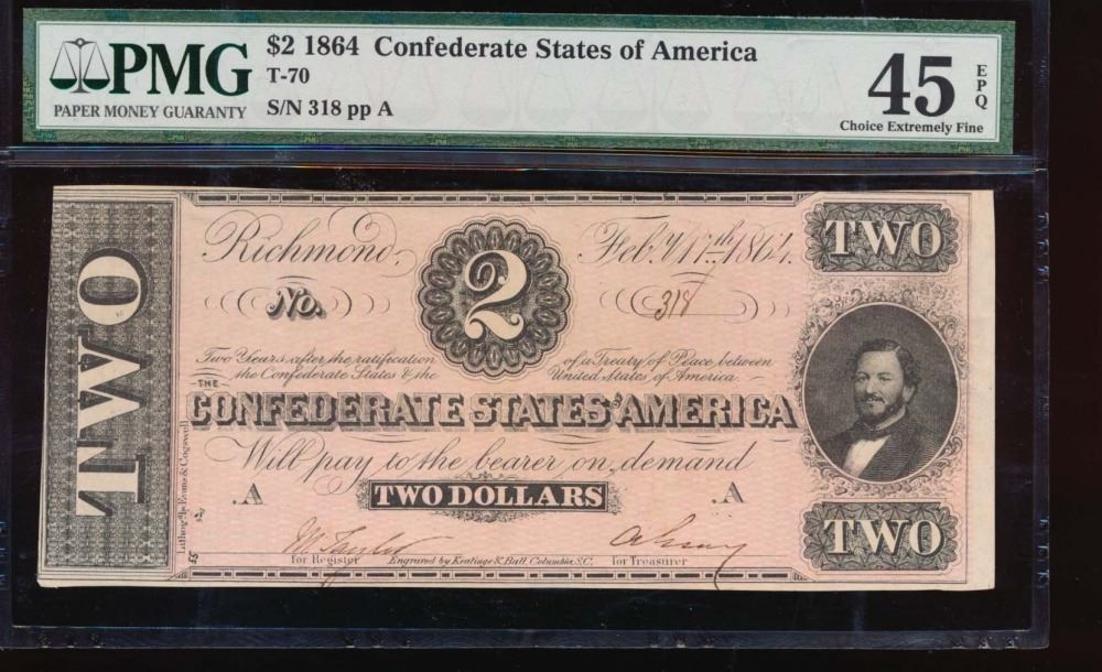 One 1864 $2 Confederate States of America Note PMG 45EPQ.