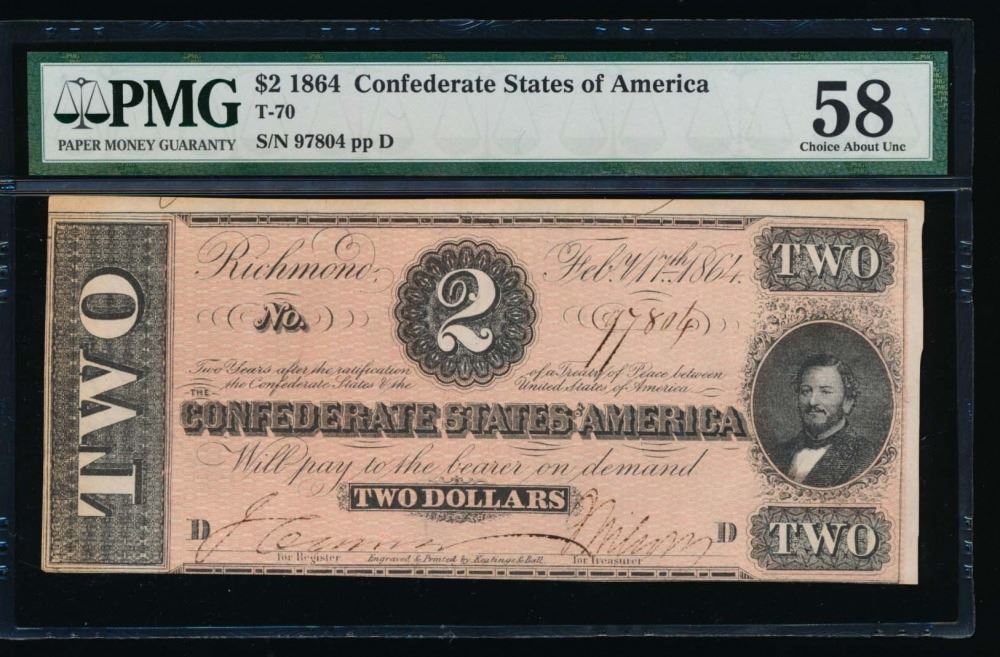 One 1864 $2 Confederate States of America Note PMG 58.