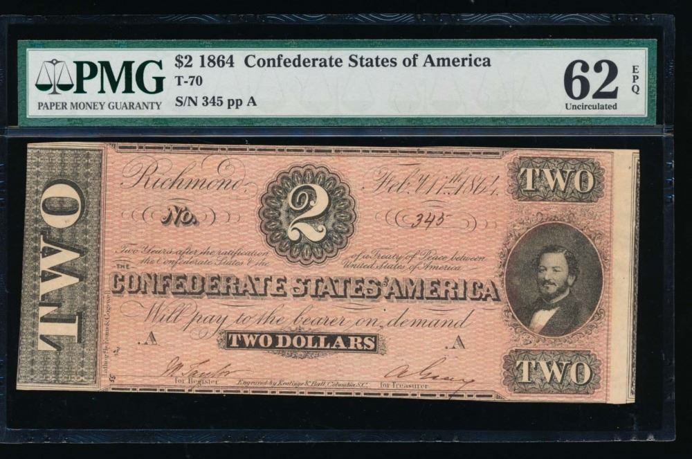 One 1864 $2 Confederate States of America Note PMG 62EPQ.