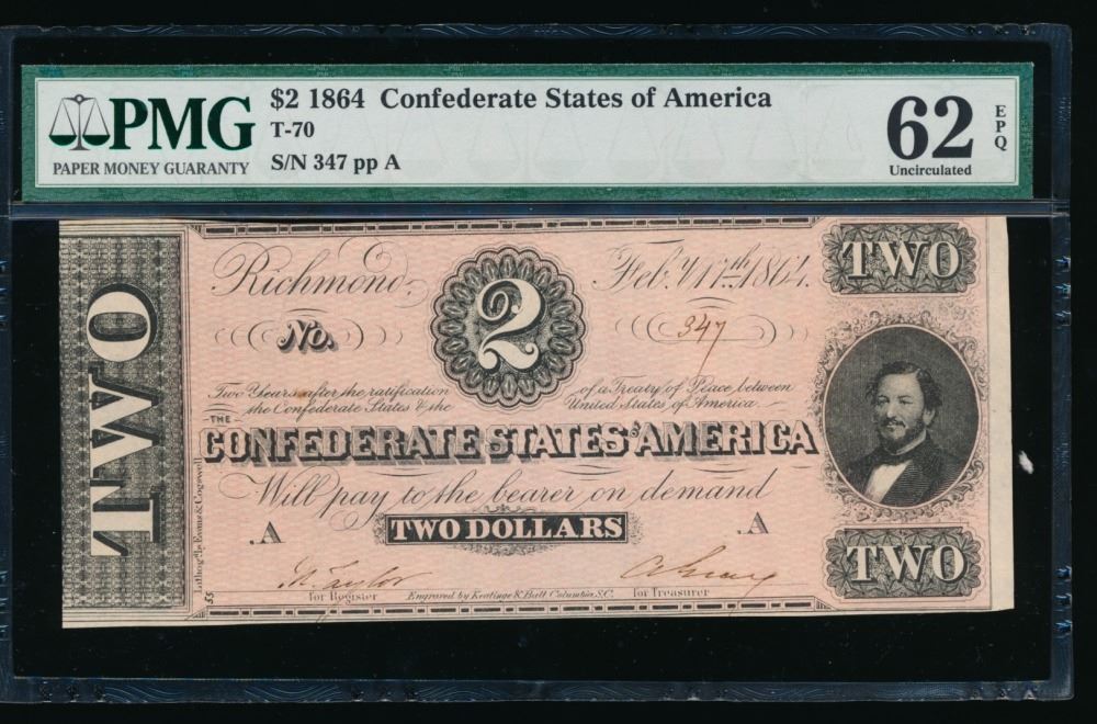 One 1864 $2 Confederate States of America Note PMG 62EPQ.