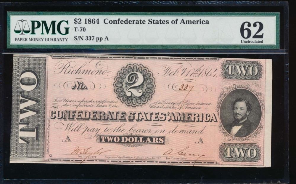 One 1864 $2 Confederate States of America Note PMG 62.
