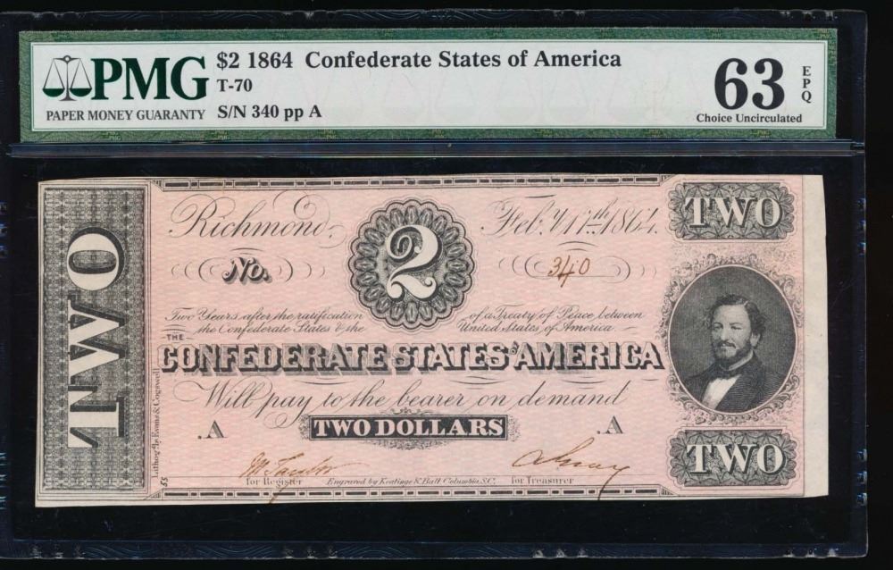 One 1864 $2 Confederate States of America Note PMG 63EPQ.