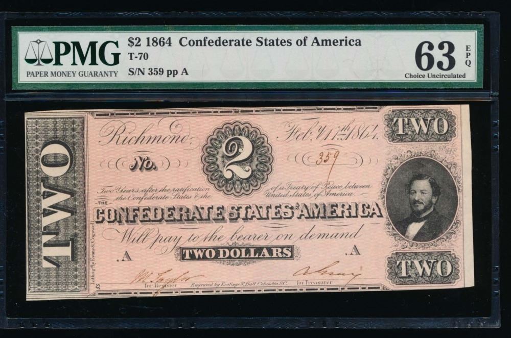 One 1864 $2 Confederate States of America Note PMG 63EPQ.