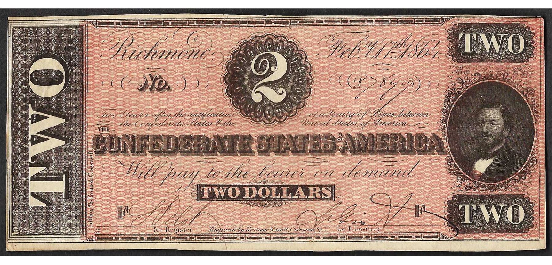 One 1864 $2 Confederate States of America Note.